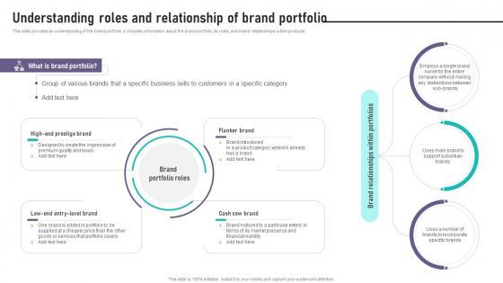 This slide provides an understanding of the brand portfolio. It includes information about the brand portfolio, its roles, and brand relationships within products. This modern and well-arranged Brand Equity Management To Understanding Roles And Relationship Of Brand Portfolio provides lots of creative possibilities. It is very simple to customize and edit with the Powerpoint Software. Just drag and drop your pictures into the shapes. All facets of this template can be edited with Powerpoint, no extra software is necessary. Add your own material, put your images in the places assigned for them, adjust the colors, and then you can show your slides to the world, with an animated slide included. This slide provides an understanding of the brand portfolio. It includes information about the brand portfolio, its roles, and brand relationships within products.