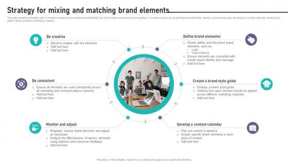 This slide presents a strategic plan to create a cohesive and consistent brand identity that will increase consumer brand recognition. It includes steps such as defining brand elements, making a brand style guide, developing a content calendar, monitoring and adjust, being consistent, and being creative. Find highly impressive Brand Equity Management To Raise Strategy For Mixing And Matching Brand Elements on Slidegeeks to deliver a meaningful presentation. You can save an ample amount of time using these presentation templates. No need to worry to prepare everything from scratch because Slidegeeks experts have already done a huge research and work for you. You need to download Brand Equity Management To Raise Strategy For Mixing And Matching Brand Elements for your upcoming presentation. All the presentation templates are 100 percent editable and you can change the color and personalize the content accordingly. Download now. This slide presents a strategic plan to create a cohesive and consistent brand identity that will increase consumer brand recognition. It includes steps such as defining brand elements, making a brand style guide, developing a content calendar, monitoring and adjust, being consistent, and being creative.