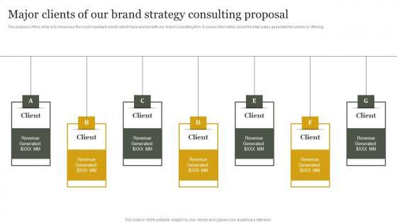 The purpose of this slide is to showcase the most important clients which have worked with our brand consulting firm. It covers information about the total sales generated for clients by offering. Power up your presentations with our Major Clients Of Our Brand Strategy Consulting Proposal Diagrams PDF single-slide PPT template. Our visually-stunning template will help you deliver your message with confidence. With easy-to-use editing options and fully customizable features, you can create polished and captivating presentations in no time. Say goodbye to boring slides and hello to impactful presentations with our top-quality template. Download now and get ready to wow your audience. singles