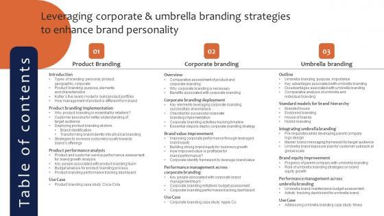 From laying roadmaps to briefing everything in detail, our templates are perfect for you. You can set the stage with your presentation slides. All you have to do is download these easy-to-edit and customizable templates. Table Of Contents Leveraging Corporate And Umbrella Branding Strategies To Enhance Mockup Pdf will help you deliver an outstanding performance that everyone would remember and praise you for. Do download this presentation today. Our Table Of Contents Leveraging Corporate And Umbrella Branding Strategies To Enhance Mockup Pdf are topically designed to provide an attractive backdrop to any subject. Use them to look like a presentation pro.