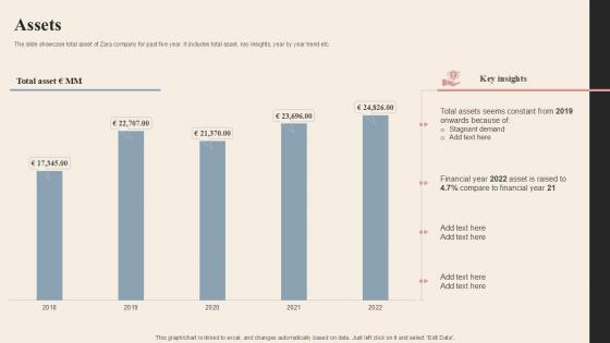 The slide showcase total asset of Zara company for past five year. It includes total asset, key insights, year by year trend etc. Find a pre-designed and impeccable Assets Branded Clothing Company Profile PPT PowerPoint CP SS V. The templates can ace your presentation without additional effort. You can download these easy-to-edit presentation templates to make your presentation stand out from others. So, what are you waiting for Download the template from Slidegeeks today and give a unique touch to your presentation. The slide showcase total asset of Zara company for past five year. It includes total asset, key insights, year by year trend etc.