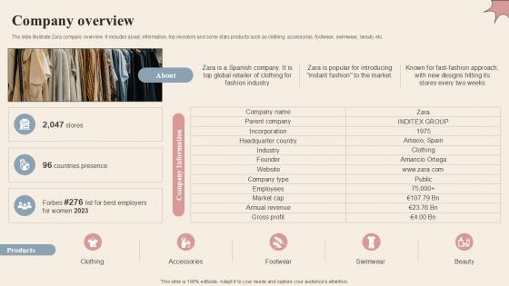 The slide illustrate Zara company overview. It includes about, information, top investors and some stats products such as clothing, accessories, footwear, swimwear, beauty etc. Want to ace your presentation in front of a live audience Our Company Overview Branded Clothing Company Profile PPT Template CP SS V can help you do that by engaging all the users towards you. Slidegeeks experts have put their efforts and expertise into creating these impeccable powerpoint presentations so that you can communicate your ideas clearly. Moreover, all the templates are customizable, and easy-to-edit and downloadable. Use these for both personal and commercial use. The slide illustrate Zara company overview. It includes about, information, top investors and some stats products such as clothing, accessories, footwear, swimwear, beauty etc.