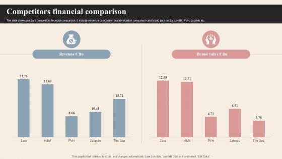 The slide showcase Zara competitors financial comparison. It includes revenue comparison brand valuation comparison and brand such as Zara, H and M, PVH, zalando etc. There are so many reasons you need a Competitors Financial Comparison Branded Clothing Company Profile PPT Example CP SS V. The first reason is you can not spend time making everything from scratch, Thus, Slidegeeks has made presentation templates for you too. You can easily download these templates from our website easily. The slide showcase Zara competitors financial comparison. It includes revenue comparison brand valuation comparison and brand such as Zara, H and M, PVH, zalando etc.