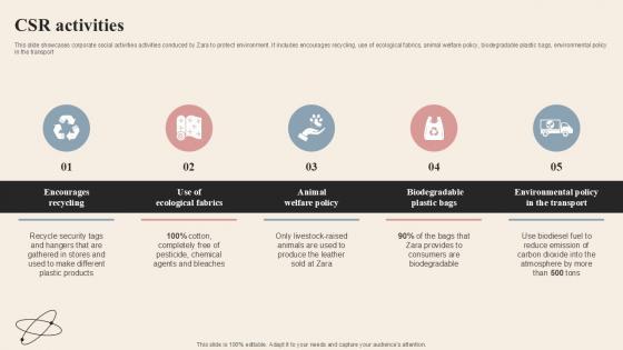 This slide showcases corporate social activities activities conduced by Zara to protect environment. It includes encourages recycling, use of ecological fabrics, animal welfare policy, biodegradable plastic bags, environmental policy in the transport. From laying roadmaps to briefing everything in detail, our templates are perfect for you. You can set the stage with your presentation slides. All you have to do is download these easy-to-edit and customizable templates. CSR Activities Branded Clothing Company Profile PPT Sample CP SS V will help you deliver an outstanding performance that everyone would remember and praise you for. Do download this presentation today. This slide showcases corporate social activities activities conduced by Zara to protect environment. It includes encourages recycling, use of ecological fabrics, animal welfare policy, biodegradable plastic bags, environmental policy in the transport.