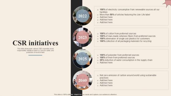 This slide showcases various CSR corporate social responsibility initiatives taken by Zara for safety and protection of environment. Present like a pro with CSR Initiatives Branded Clothing Company Profile PPT Presentation CP SS V. Create beautiful presentations together with your team, using our easy-to-use presentation slides. Share your ideas in real-time and make changes on the fly by downloading our templates. So whether you are in the office, on the go, or in a remote location, you can stay in sync with your team and present your ideas with confidence. With Slidegeeks presentation got a whole lot easier. Grab these presentations today. This slide showcases various CSR corporate social responsibility initiatives taken by Zara for safety and protection of environment.