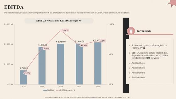 The slide showcase Zara organization earning before interest, tax, amortization and depreciation. It includes elements such as EBITDA, margin percentage, key insights etc. Slidegeeks is here to make your presentations a breeze with EBITDA Branded Clothing Company Profile PPT Presentation CP SS V With our easy-to-use and customizable templates, you can focus on delivering your ideas rather than worrying about formatting. With a variety of designs to choose from, you are sure to find one that suits your needs. And with animations and unique photos, illustrations, and fonts, you can make your presentation pop. So whether you are giving a sales pitch or presenting to the board, make sure to check out Slidegeeks first The slide showcase Zara organization earning before interest, tax, amortization and depreciation. It includes elements such as EBITDA, margin percentage, key insights etc.