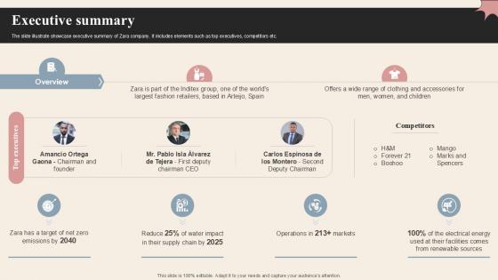The slide illustrate showcase executive summary of Zara company. It includes elements such as top executives, competitors etc. Whether you have daily or monthly meetings, a brilliant presentation is necessary. Executive Summary Branded Clothing Company Profile PPT Template CP SS V can be your best option for delivering a presentation. Represent everything in detail using Executive Summary Branded Clothing Company Profile PPT Template CP SS V and make yourself stand out in meetings. The template is versatile and follows a structure that will cater to your requirements. All the templates prepared by Slidegeeks are easy to download and edit. Our research experts have taken care of the corporate themes as well. So, give it a try and see the results. The slide illustrate showcase executive summary of Zara company. It includes elements such as top executives, competitors etc.