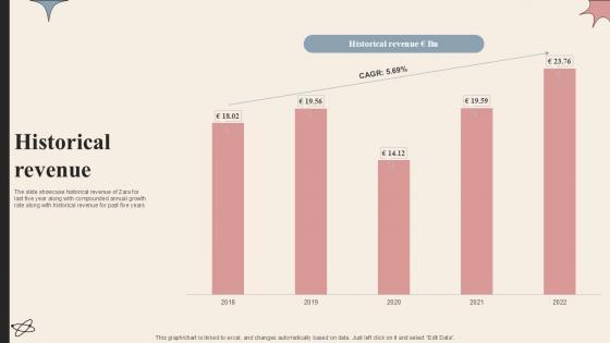 The slide showcase historical revenue of Zara for last five year along with compounded annual growth rate along with historical revenue for past five years. Crafting an eye-catching presentation has never been more straightforward. Let your presentation shine with this tasteful yet straightforward Historical Revenue Branded Clothing Company Profile PPT PowerPoint CP SS V template. It offers a minimalistic and classy look that is great for making a statement. The colors have been employed intelligently to add a bit of playfulness while still remaining professional. Construct the ideal Historical Revenue Branded Clothing Company Profile PPT PowerPoint CP SS V that effortlessly grabs the attention of your audience Begin now and be certain to wow your customers The slide showcase historical revenue of Zara for last five year along with compounded annual growth rate along with historical revenue for past five years.