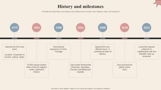 This slide showcases history and milestone Zara clothing brand. It includes major milestone, history and background. Make sure to capture your audiences attention in your business displays with our gratis customizable History And Milestones Branded Clothing Company Profile PPT PowerPoint CP SS V. These are great for business strategies, office conferences, capital raising or task suggestions. If you desire to acquire more customers for your tech business and ensure they stay satisfied, create your own sales presentation with these plain slides. This slide showcases history and milestone Zara clothing brand. It includes major milestone, history and background.