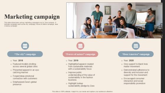 This slide showcases various marketing campaigns run by Zara company. It includes campaign such as the city campaign, forces of nature campaign, dear America campaign. Welcome to our selection of the Marketing Campaign Branded Clothing Company Profile PPT Example CP SS V. These are designed to help you showcase your creativity and bring your sphere to life. Planning and Innovation are essential for any business that is just starting out. This collection contains the designs that you need for your everyday presentations. All of our PowerPoints are 100Percent editable, so you can customize them to suit your needs. This multi-purpose template can be used in various situations. Grab these presentation templates today. This slide showcases various marketing campaigns run by Zara company. It includes campaign such as the city campaign, forces of nature campaign, dear America campaign.
