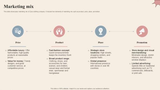 This slide showcases marketing mix of Zara clothing company. It include fore elements of marketing mix such as product, price, place, promotion. Explore a selection of the finest Marketing Mix Branded Clothing Company Profile PPT Slides CP SS V here. With a plethora of professionally designed and pre-made slide templates, you can quickly and easily find the right one for your upcoming presentation. You can use our Marketing Mix Branded Clothing Company Profile PPT Slides CP SS V to effectively convey your message to a wider audience. Slidegeeks has done a lot of research before preparing these presentation templates. The content can be personalized and the slides are highly editable. Grab templates today from Slidegeeks. This slide showcases marketing mix of Zara clothing company. It include fore elements of marketing mix such as product, price, place, promotion.