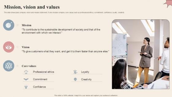 The slide showcases company vision and mission statement. It also include company core values such as professional ethics, commitment, confidence, loyalty, creativity. The Mission Vision And Values Branded Clothing Company Profile PPT PowerPoint CP SS V is a compilation of the most recent design trends as a series of slides. It is suitable for any subject or industry presentation, containing attractive visuals and photo spots for businesses to clearly express their messages. This template contains a variety of slides for the user to input data, such as structures to contrast two elements, bullet points, and slides for written information. Slidegeeks is prepared to create an impression. The slide showcases company vision and mission statement. It also include company core values such as professional ethics, commitment, confidence, loyalty, creativity.