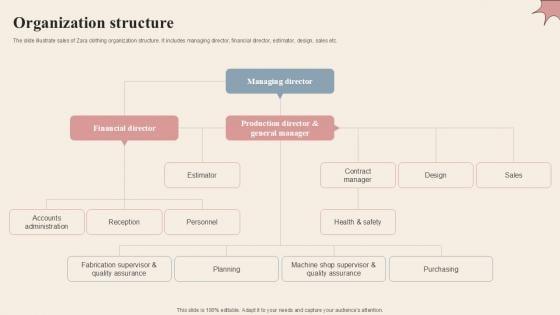 The slide illustrate sales of Zara clothing organization structure. It includes managing director, financial director, estimator, design, sales etc. Are you searching for a Organization Structure Branded Clothing Company Profile PPT Template CP SS V that is uncluttered, straightforward, and original Its easy to edit, and you can change the colors to suit your personal or business branding. For a presentation that expresses how much effort you have put in, this template is ideal With all of its features, including tables, diagrams, statistics, and lists, its perfect for a business plan presentation. Make your ideas more appealing with these professional slides. Download Organization Structure Branded Clothing Company Profile PPT Template CP SS V from Slidegeeks today. The slide illustrate sales of Zara clothing organization structure. It includes managing director, financial director, estimator, design, sales etc.