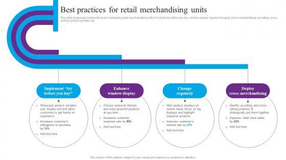 This slide showcases best practices for maintaining retail merchandising units. It includes try before you buy, window display, regular changing, cross merchandising, up selling, cross selling, product samples, etc. Do you have an important presentation coming up Are you looking for something that will make your presentation stand out from the rest Look no further than Best Practices For Retail Merchandising Centric Marketing To Enhance Brand Connections Mockup Pdf. With our professional designs, you can trust that your presentation will pop and make delivering it a smooth process. And with Slidegeeks, you can trust that your presentation will be unique and memorable. So why wait Grab Best Practices For Retail Merchandising Centric Marketing To Enhance Brand Connections Mockup Pdf today and make your presentation stand out from the rest This slide showcases best practices for maintaining retail merchandising units. It includes try before you buy, window display, regular changing, cross merchandising, up selling, cross selling, product samples, etc.