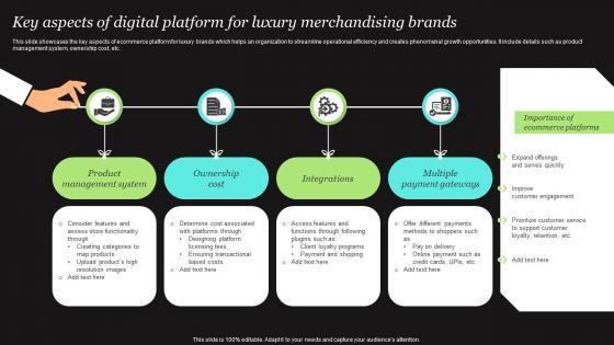This slide showcases the key aspects of ecommerce platform for luxury brands which helps an organization to streamline operational efficiency and creates phenomenal growth opportunities. It include details such as product management system, ownership cost, etc. Showcasing this set of slides titled Key Aspects Of Digital Platform For Luxury Merchandising Brands Brochure Pdf The topics addressed in these templates are Product Management System, Ownership Cost, Integrations All the content presented in this PPT design is completely editable. Download it and make adjustments in color, background, font etc. as per your unique business setting. This slide showcases the key aspects of ecommerce platform for luxury brands which helps an organization to streamline operational efficiency and creates phenomenal growth opportunities. It include details such as product management system, ownership cost, etc.