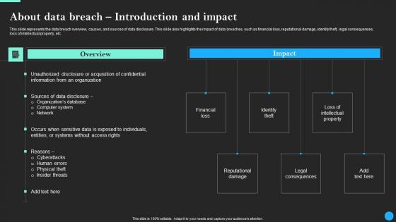 This slide represents the data breach overview, causes, and sources of data disclosure. This slide also highlights the impact of data breaches, such as financial loss, reputational damage, identity theft, legal consequences, loss of intellectual property, etc. Boost your pitch with our creative About Data Breach Introduction And Impact Data Fortification Strengthening Defenses. Deliver an awe-inspiring pitch that will mesmerize everyone. Using these presentation templates you will surely catch everyones attention. You can browse the ppts collection on our website. We have researchers who are experts at creating the right content for the templates. So you do not have to invest time in any additional work. Just grab the template now and use them. This slide represents the data breach overview, causes, and sources of data disclosure. This slide also highlights the impact of data breaches, such as financial loss, reputational damage, identity theft, legal consequences, loss of intellectual property, etc.
