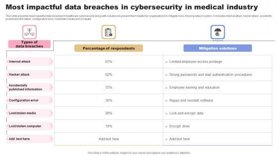 This slide presents most impactful data breaches in healthcare cybersecurity along with solutions to prevent them helpful for organizations to mitigate risks of losing data or system. It includes internal attack, hacker attack, accidently published information, configuration error, lost stolen media and computer. Showcasing this set of slides titled Most Impactful Data Breaches In Cybersecurity In Medical Industry Inspiration Pdf. The topics addressed in these templates are Data Breaches, Respondents, Mitigation Solutions. All the content presented in this PPT design is completely editable. Download it and make adjustments in color, background, font etc. as per your unique business setting. This slide presents most impactful data breaches in healthcare cybersecurity along with solutions to prevent them helpful for organizations to mitigate risks of losing data or system. It includes internal attack, hacker attack, accidently published information, configuration error, lost stolen media and computer.