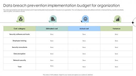 This slide represents the estimated and actual cost of implementing data breach prevention measures in an organization. The cost categories are security software and tools, employee training, security consultants, data encryption, and network security.If your project calls for a presentation, then Slidegeeks is your go-to partner because we have professionally designed, easy-to-edit templates that are perfect for any presentation. After downloading, you can easily edit Data Breach Prevention Implementation Budget For Organization Data Fortification Strengthening Defenses and make the changes accordingly. You can rearrange slides or fill them with different images. Check out all the handy templates This slide represents the estimated and actual cost of implementing data breach prevention measures in an organization. The cost categories are security software and tools, employee training, security consultants, data encryption, and network security.