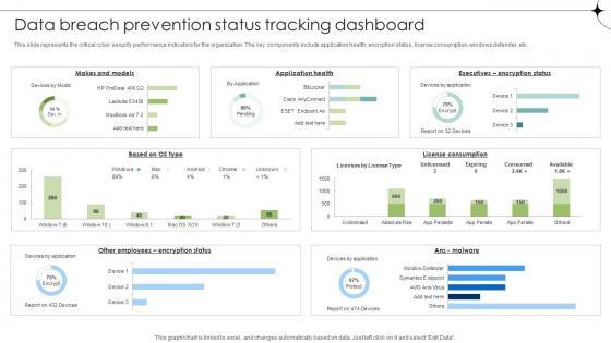This slide represents the critical cyber security performance indicators for the organization. The key components include application health, encryption status, license consumption, windows defender, etc.Are you in need of a template that can accommodate all of your creative concepts This one is crafted professionally and can be altered to fit any style. Use it with Google Slides or PowerPoint. Include striking photographs, symbols, depictions, and other visuals. Fill, move around, or remove text boxes as desired. Test out color palettes and font mixtures. Edit and save your work, or work with colleagues. Download Data Breach Prevention Status Tracking Dashboard Data Fortification Strengthening Defenses and observe how to make your presentation outstanding. Give an impeccable presentation to your group and make your presentation unforgettable. This slide represents the critical cyber security performance indicators for the organization. The key components include application health, encryption status, license consumption, windows defender, etc.
