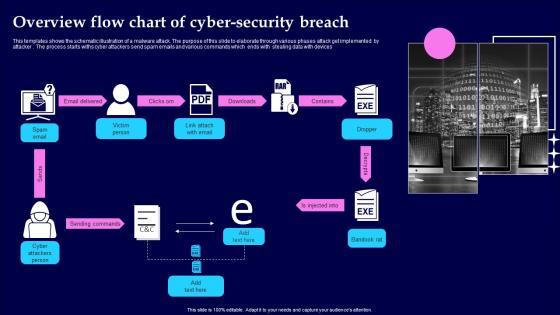 This templates shows the schematic illustration of a malware attack. The purpose of this slide to elaborate through various phases attack get implemented by attacker . The process starts withs cyber attackers send spam emails and various commands which ends with stealing data with devices Pitch your topic with ease and precision using this Overview Flow Chart Of Cyber Security Breach Summary Pdf This layout presents information on Email Delivered, Sending Commands, Injected Into It is also available for immediate download and adjustment. So, changes can be made in the color, design, graphics or any other component to create a unique layout. This templates shows the schematic illustration of a malware attack. The purpose of this slide to elaborate through various phases attack get implemented by attacker . The process starts withs cyber attackers send spam emails and various commands which ends with stealing data with devices