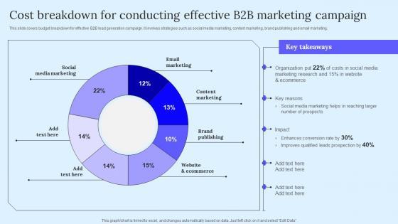 This slide covers budget breakdown for effective B2B lead generation campaign. It involves strategies such as social media marketing, content marketing, brand publishing and email marketing. Are you in need of a template that can accommodate all of your creative concepts This one is crafted professionally and can be altered to fit any style. Use it with Google Slides or PowerPoint. Include striking photographs, symbols, depictions, and other visuals. Fill, move around, or remove text boxes as desired. Test out color palettes and font mixtures. Edit and save your work, or work with colleagues. Download Cost Breakdown For Conducting B2B Marketing Techniques To Attract Potential Graphics Pdf and observe how to make your presentation outstanding. Give an impeccable presentation to your group and make your presentation unforgettable. This slide covers budget breakdown for effective B2B lead generation campaign. It involves strategies such as social media marketing, content marketing, brand publishing and email marketing.