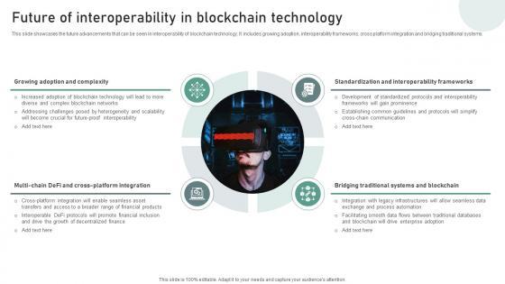 This slide showcases the future advancements that can be seen in interoperability of blockchain technology. It includes growing adoption, interoperability frameworks, cross platform integration and bridging traditional systems. If your project calls for a presentation, then Slidegeeks is your go-to partner because we have professionally designed, easy-to-edit templates that are perfect for any presentation. After downloading, you can easily edit Bridging Blockchains A Deep Future Of Interoperability In Blockchain Technology BCT SS V and make the changes accordingly. You can rearrange slides or fill them with different images. Check out all the handy templates This slide showcases the future advancements that can be seen in interoperability of blockchain technology. It includes growing adoption, interoperability frameworks, cross platform integration and bridging traditional systems.
