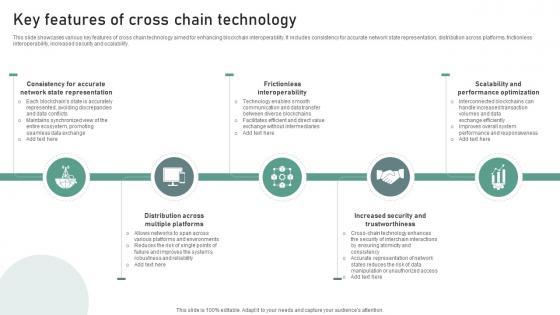 This slide showcases various key features of cross chain technology aimed for enhancing blockchain interoperability. It includes consistency for accurate network state representation, distribution across platforms, frictionless interoperability, increased security and scalability. Slidegeeks has constructed Bridging Blockchains A Deep Key Features Of Cross Chain Technology BCT SS V after conducting extensive research and examination. These presentation templates are constantly being generated and modified based on user preferences and critiques from editors. Here, you will find the most attractive templates for a range of purposes while taking into account ratings and remarks from users regarding the content. This is an excellent jumping-off point to explore our content and will give new users an insight into our top-notch PowerPoint Templates. This slide showcases various key features of cross chain technology aimed for enhancing blockchain interoperability. It includes consistency for accurate network state representation, distribution across platforms, frictionless interoperability, increased security and scalability.