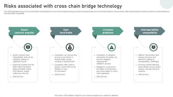 This slide highlights various risks concerning the implementation of cross chain bridge technology to achieve interoperability across blockchain networks. Risks include smart contract exploits, liveness problems, user fund thefts and interoperability compatibility. Create an editable Seamless Integration The Power Risks Associated With Cross Chain Bridge Technology BCT SS V that communicates your idea and engages your audience. Whether you are presenting a business or an educational presentation, pre-designed presentation templates help save time. Seamless Integration The Power Risks Associated With Cross Chain Bridge Technology BCT SS V is highly customizable and very easy to edit, covering many different styles from creative to business presentations. Slidegeeks has creative team members who have crafted amazing templates. So, go and get them without any delay. This slide highlights various risks concerning the implementation of cross chain bridge technology to achieve interoperability across blockchain networks. Risks include smart contract exploits, liveness problems, user fund thefts and interoperability compatibility.