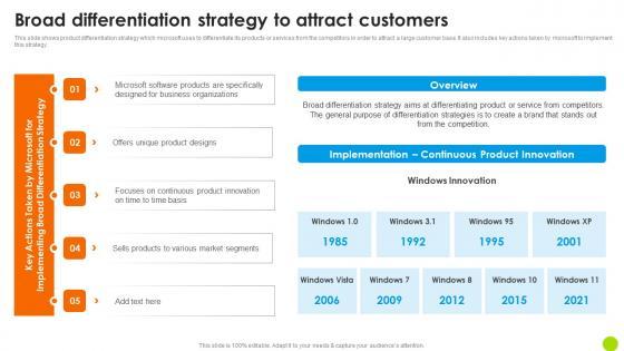 This slide shows product differentiation strategy which microsoft uses to differentiate its products or services from the competitors in order to attract a large customer base. It also includes key actions taken by microsoft to implement this strategy. Do you have to make sure that everyone on your team knows about any specific topic I yes, then you should give Micosoft Intensive Growth Broad Differentiation Strategy To Attract Customers Strategy SS V a try. Our experts have put a lot of knowledge and effort into creating this impeccable Micosoft Intensive Growth Broad Differentiation Strategy To Attract Customers Strategy SS V. You can use this template for your upcoming presentations, as the slides are perfect to represent even the tiniest detail. You can download these templates from the Slidegeeks website and these are easy to edit. So grab these today This slide shows product differentiation strategy which microsoft uses to differentiate its products or services from the competitors in order to attract a large customer base. It also includes key actions taken by microsoft to implement this strategy.