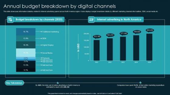 This slide showcases information statistics related to internet advertising spend across North America region. It also displays budget breakdown details by different marketing channels like tradition, SEM, social media etc. Here you can discover an assortment of the finest PowerPoint and Google Slides templates. With these templates, you can create presentations for a variety of purposes while simultaneously providing your audience with an eye catching visual experience. Download Annual Budget Breakdown By Digital Channels Ppt Styles Outfit PDF to deliver an impeccable presentation. These templates will make your job of preparing presentations much quicker, yet still, maintain a high level of quality. Slidegeeks has experienced researchers who prepare these templates and write high quality content for you. Later on, you can personalize the content by editing the Annual Budget Breakdown By Digital Channels Ppt Styles Outfit PDF.