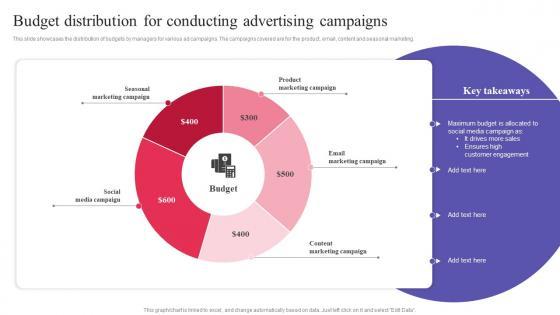 This slide showcases the distribution of budgets by managers for various ad campaigns. The campaigns covered are for the product, email, content and seasonal marketing. Find a pre-designed and impeccable Budget Distribution For Conducting Advertising Campaigns Demonstration PDF. The templates can ace your presentation without additional effort. You can download these easy-to-edit presentation templates to make your presentation stand out from others. So, what are you waiting for Download the template from Slidegeeks today and give a unique touch to your presentation.