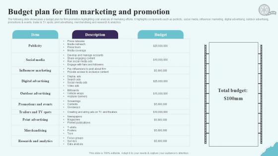 The following slide showcases a budget plan for film promotion highlighting cost analysis of marketing efforts. It highlights components such as publicity, social media, influencer marketing, digital advertising, outdoor advertising, promotions and events, trailer and TV spots, print advertising, merchandising and research and analytics. Want to ace your presentation in front of a live audience Our Budget Plan For Film Marketing And Promotion Strategic Plan To Increase Film Ppt Template Strategy SS V can help you do that by engaging all the users towards you. Slidegeeks experts have put their efforts and expertise into creating these impeccable powerpoint presentations so that you can communicate your ideas clearly. Moreover, all the templates are customizable, and easy-to-edit and downloadable. Use these for both personal and commercial use. The following slide showcases a budget plan for film promotion highlighting cost analysis of marketing efforts. It highlights components such as publicity, social media, influencer marketing, digital advertising, outdoor advertising, promotions and events, trailer and TV spots, print advertising, merchandising and research and analytics.