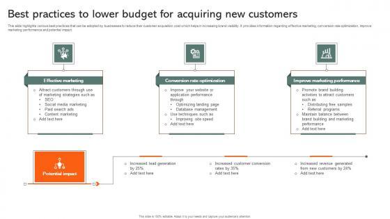 This slide highlights various best practices that can be adopted by businesses to reduce their customer acquisition cost which helps in increasing brand visibility. It provides information regarding effective marketing, conversion rate optimization, improve marketing performance and potential impact. Showcasing this set of slides titled Best Practices To Lower Budget For Acquiring New Customers Rules Pdf. The topics addressed in these templates are Effective Marketing, Conversion Rate Optimization, Improve Marketing Performance. All the content presented in this PPT design is completely editable. Download it and make adjustments in color, background, font etc. as per your unique business setting. This slide highlights various best practices that can be adopted by businesses to reduce their customer acquisition cost which helps in increasing brand visibility. It provides information regarding effective marketing, conversion rate optimization, improve marketing performance and potential impact.