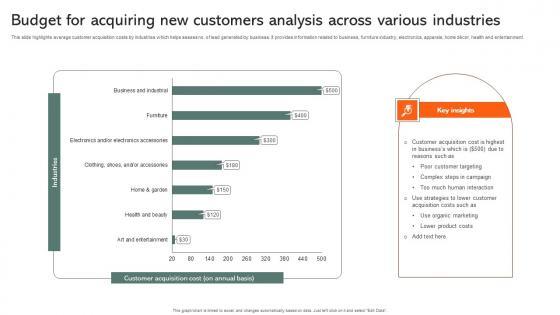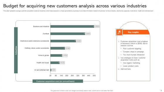 This slide highlights average customer acquisition costs by industries which helps assess no. of lead generated by business. It provides information related to business, furniture industry, electronics, apparels, home decor, health and entertainment. Pitch your topic with ease and precision using this Budget For Acquiring New Customers Analysis Across Various Industries Sample Pdf. This layout presents information on Industries, Customer Acquisition Cost. It is also available for immediate download and adjustment. So, changes can be made in the color, design, graphics or any other component to create a unique layout. This slide highlights average customer acquisition costs by industries which helps assess no. of lead generated by business. It provides information related to business, furniture industry, electronics, apparels, home decor, health and entertainment.