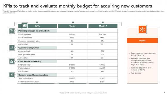This slide showcases KPIs that can be used to monitor consumer acquisition cost on monthly basis with potential impact of business performance. It provides information regarding KPIs such as pageviews, subscribers, conversion rates, lead generation rates, paid marketing etc. Pitch your topic with ease and precision using this KPIs To Track And Evaluate Monthly Budget For Acquiring New Customers Microsoft Pdf. This layout presents information on Customer Journey Funnel, Costs Incurred In Marketing. It is also available for immediate download and adjustment. So, changes can be made in the color, design, graphics or any other component to create a unique layout. This slide showcases KPIs that can be used to monitor consumer acquisition cost on monthly basis with potential impact of business performance. It provides information regarding KPIs such as pageviews, subscribers, conversion rates, lead generation rates, paid marketing etc.