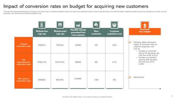 This slide showcases potential impact of increase in conversion rates on customer acquisition costs which helps in accurate determining in cost per lead generated. It provides information regarding website free sign ups, paid sign ups, monthly revenue generated, new consumers and customer acquisition cost. Showcasing this set of slides titled Impact Of Conversion Rates On Budget For Acquiring New Customers Diagrams Pdf. The topics addressed in these templates are Website Free, Website Paid, Monthly Revenue. All the content presented in this PPT design is completely editable. Download it and make adjustments in color, background, font etc. as per your unique business setting. This slide showcases potential impact of increase in conversion rates on customer acquisition costs which helps in accurate determining in cost per lead generated. It provides information regarding website free sign ups, paid sign ups, monthly revenue generated, new consumers and customer acquisition cost.