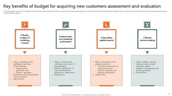 This slide highlight importance of estimating and analyzing customer acquisition cost which helps to achieve business objectives. It provides information regarding analyze marketing channel, improve salesmarketing performance, define payback period and effective decision making. Showcasing this set of slides titled Key Benefits Of Budget For Acquiring New Customers Assessment And Evaluation Introduction Pdf. The topics addressed in these templates are Marketing Channel, Marketing Performance, Payback Period. All the content presented in this PPT design is completely editable. Download it and make adjustments in color, background, font etc. as per your unique business setting. This slide highlight importance of estimating and analyzing customer acquisition cost which helps to achieve business objectives. It provides information regarding analyze marketing channel, improve salesmarketing performance, define payback period and effective decision making.