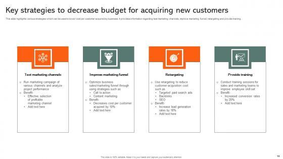 This slide highlights various strategies which can be used to lower cost per customer acquired by business. It provides information regarding test marketing channels, improve marketing funnel, retargeting and provide training. Showcasing this set of slides titled Key Strategies To Decrease Budget For Acquiring New Customers Designs Pdf. The topics addressed in these templates are Test Marketing Channels, Improve Marketing Funnel, Retargeting. All the content presented in this PPT design is completely editable. Download it and make adjustments in color, background, font etc. as per your unique business setting. This slide highlights various strategies which can be used to lower cost per customer acquired by business. It provides information regarding test marketing channels, improve marketing funnel, retargeting and provide training.
