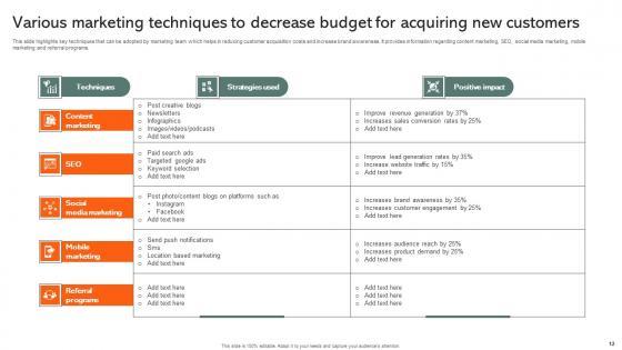 This slide highlights key techniques that can be adopted by marketing team which helps in reducing customer acquisition costs and increase brand awareness. It provides information regarding content marketing, SEO, social media marketing, mobile marketing and referral programs. Showcasing this set of slides titled Various Marketing Techniques To Decrease Budget For Acquiring New Customers Formats Pdf. The topics addressed in these templates are Content Marketing, Social Media Marketing, Mobile Marketing. All the content presented in this PPT design is completely editable. Download it and make adjustments in color, background, font etc. as per your unique business setting. This slide highlights key techniques that can be adopted by marketing team which helps in reducing customer acquisition costs and increase brand awareness. It provides information regarding content marketing, SEO, social media marketing, mobile marketing and referral programs.