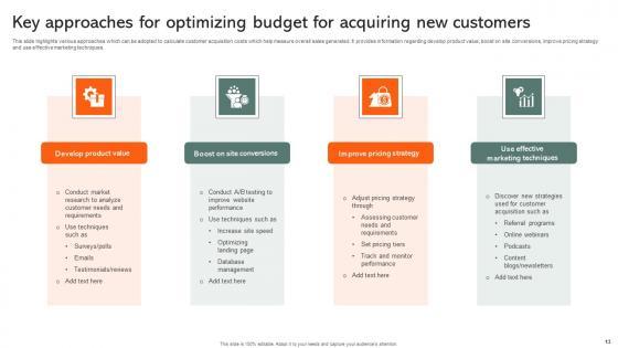 This slide highlights various approaches which can be adopted to calculate customer acquisition costs which help measure overall sales generated. It provides information regarding develop product value, boost on site conversions, improve pricing strategy and use effective marketing techniques. Pitch your topic with ease and precision using this Key Approaches For Optimizing Budget For Acquiring New Customers Structure Pdf. This layout presents information on Develop Product Value, Boost On Site Conversions, Improve Pricing Strategy. It is also available for immediate download and adjustment. So, changes can be made in the color, design, graphics or any other component to create a unique layout. This slide highlights various approaches which can be adopted to calculate customer acquisition costs which help measure overall sales generated. It provides information regarding develop product value, boost on site conversions, improve pricing strategy and use effective marketing techniques.