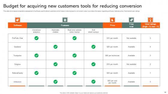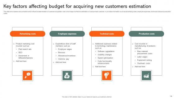 Improve your presentation delivery using this Budget For Acquiring New Customers Ppt Powerpoint Presentation Complete Deck With Slides. Support your business vision and objectives using this well-structured PPT deck. This template offers a great starting point for delivering beautifully designed presentations on the topic of your choice. Comprising twenty this professionally designed template is all you need to host discussion and meetings with collaborators. Each slide is self-explanatory and equipped with high-quality graphics that can be adjusted to your needs. Therefore, you will face no difficulty in portraying your desired content using this PPT slideshow. This PowerPoint slideshow contains every important element that you need for a great pitch. It is not only editable but also available for immediate download and utilization. The color, font size, background, shapes everything can be modified to create your unique presentation layout. Therefore, download it now. Our Budget For Acquiring New Customers Ppt Powerpoint Presentation Complete Deck With Slides are topically designed to provide an attractive backdrop to any subject. Use them to look like a presentation pro.