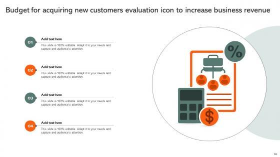 Showcasing this set of slides titled Budget For Acquiring New Customers Evaluation Icon To Increase Business Revenue Mockup Pdf. The topics addressed in these templates are Budget For Acquiring, Increase Business Revenue. All the content presented in this PPT design is completely editable. Download it and make adjustments in color, background, font etc. as per your unique business setting. Our Budget For Acquiring New Customers Evaluation Icon To Increase Business Revenue Mockup Pdf are topically designed to provide an attractive backdrop to any subject. Use them to look like a presentation pro.
