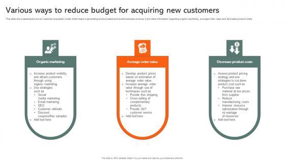 This slide showcases tips to lower customer acquisition costs which helps in generating product sales and boost business revenue. It provides information regarding organic marketing, average order value and decrease product costs. Pitch your topic with ease and precision using this Various Ways To Reduce Budget For Acquiring New Customers Themes Pdf. This layout presents information on Organic Marketing, Average Order Value, Decrease Product Costs. It is also available for immediate download and adjustment. So, changes can be made in the color, design, graphics or any other component to create a unique layout. This slide showcases tips to lower customer acquisition costs which helps in generating product sales and boost business revenue. It provides information regarding organic marketing, average order value and decrease product costs.