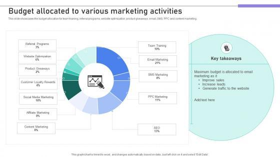 This slide showcases the budget allocation for team training, referral programs, website optimization, product giveaways, email, SMS, PPC and content marketing. Create an editable Building Stronger Customer Budget Allocated To Various Marketing Activities SA SS V that communicates your idea and engages your audience. Whether you are presenting a business or an educational presentation, pre-designed presentation templates help save time. Building Stronger Customer Budget Allocated To Various Marketing Activities SA SS V is highly customizable and very easy to edit, covering many different styles from creative to business presentations. Slidegeeks has creative team members who have crafted amazing templates. So, go and get them without any delay. This slide showcases the budget allocation for team training, referral programs, website optimization, product giveaways, email, SMS, PPC and content marketing.