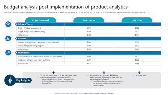 This slide highlights quarterly budget allocation of product analytics aimed at increasing organizational productivity and efficiency. It covers costs under heads such as software tools, activities and internal tools From laying roadmaps to briefing everything in detail, our templates are perfect for you. You can set the stage with your presentation slides. All you have to do is download these easy-to-edit and customizable templates. Budget Analysis Post Implementation Of Product Analytics Product Analytics Implementation Data Analytics V will help you deliver an outstanding performance that everyone would remember and praise you for. Do download this presentation today. This slide highlights quarterly budget allocation of product analytics aimed at increasing organizational productivity and efficiency. It covers costs under heads such as software tools, activities and internal tools