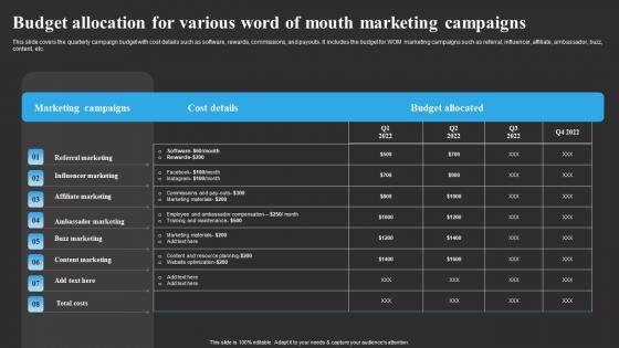 This slide covers the quarterly campaign budget with cost details such as software, rewards, commissions, and payouts. It includes the budget for WOM marketing campaigns such as referral, influencer, affiliate, ambassador, buzz, content, etc. Want to ace your presentation in front of a live audience Our Budget Allocation For Various Word Of Mouth Tracking Word Mouth Marketing Elements PDF can help you do that by engaging all the users towards you. Slidegeeks experts have put their efforts and expertise into creating these impeccable powerpoint presentations so that you can communicate your ideas clearly. Moreover, all the templates are customizable, and easy-to-edit and downloadable. Use these for both personal and commercial use. This slide covers the quarterly campaign budget with cost details such as software, rewards, commissions, and payouts. It includes the budget for WOM marketing campaigns such as referral, influencer, affiliate, ambassador, buzz, content, etc.