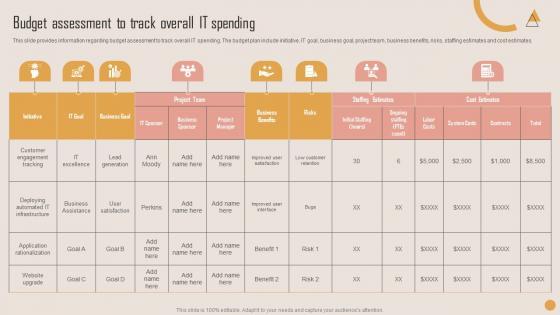 This slide provides information regarding budget assessment to track overall IT spending. The budget plan include initiative, IT goal, business goal, project team, business benefits, risks, staffing estimates and cost estimates. Here you can discover an assortment of the finest PowerPoint and Google Slides templates. With these templates, you can create presentations for a variety of purposes while simultaneously providing your audience with an eye catching visual experience. Download Budget Assessment To Track Overall IT Spending Information PDF to deliver an impeccable presentation. These templates will make your job of preparing presentations much quicker, yet still, maintain a high level of quality. Slidegeeks has experienced researchers who prepare these templates and write high quality content for you. Later on, you can personalize the content by editing the Budget Assessment To Track Overall IT Spending Information PDF.