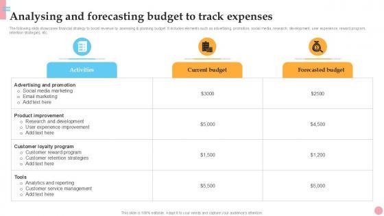 The following slide showcases financial strategy to boost revenue by assessing and planning budget. It includes elements such as advertising, promotion, social media, research, development, user experience, reward program, retention strategies, etc. Want to ace your presentation in front of a live audience Our Analysing And Forecasting Budget How To Improve Company PPT Slide Strategy SS V can help you do that by engaging all the users towards you. Slidegeeks experts have put their efforts and expertise into creating these impeccable powerpoint presentations so that you can communicate your ideas clearly. Moreover, all the templates are customizable, and easy-to-edit and downloadable. Use these for both personal and commercial use. The following slide showcases financial strategy to boost revenue by assessing and planning budget. It includes elements such as advertising, promotion, social media, research, development, user experience, reward program, retention strategies, etc.