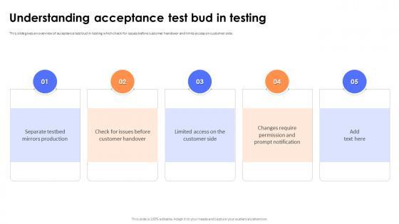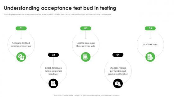 This slide gives an overview of acceptance test bud in testing which check for issues before customer handover and limits access on customer side. Find a pre designed and impeccable Understanding Acceptance Test Bud In Testing Acceptance Testing PPT Presentation. The templates can ace your presentation without additional effort. You can download these easy to edit presentation templates to make your presentation stand out from others. So, what are you waiting for Download the template from Slidegeeks today and give a unique touch to your presentation. This slide gives an overview of acceptance test bud in testing which check for issues before customer handover and limits access on customer side.