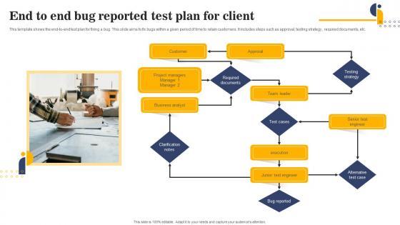 This template shows the end-to-end test plan for fixing a bug. This slide aims to fix bugs within a given period of time to retain customers. It includes steps such as approval, testing strategy , required documents, etc.Showcasing this set of slides titled End To End Bug Reported Test Plan For Client Slides Pdf The topics addressed in these templates are Business Analyst, Alternative Test Case, Testing Strategy All the content presented in this PPT design is completely editable. Download it and make adjustments in color, background, font etc. as per your unique business setting. This template shows the end to end test plan for fixing a bug. This slide aims to fix bugs within a given period of time to retain customers. It includes steps such as approval, testing strategy , required documents, etc.